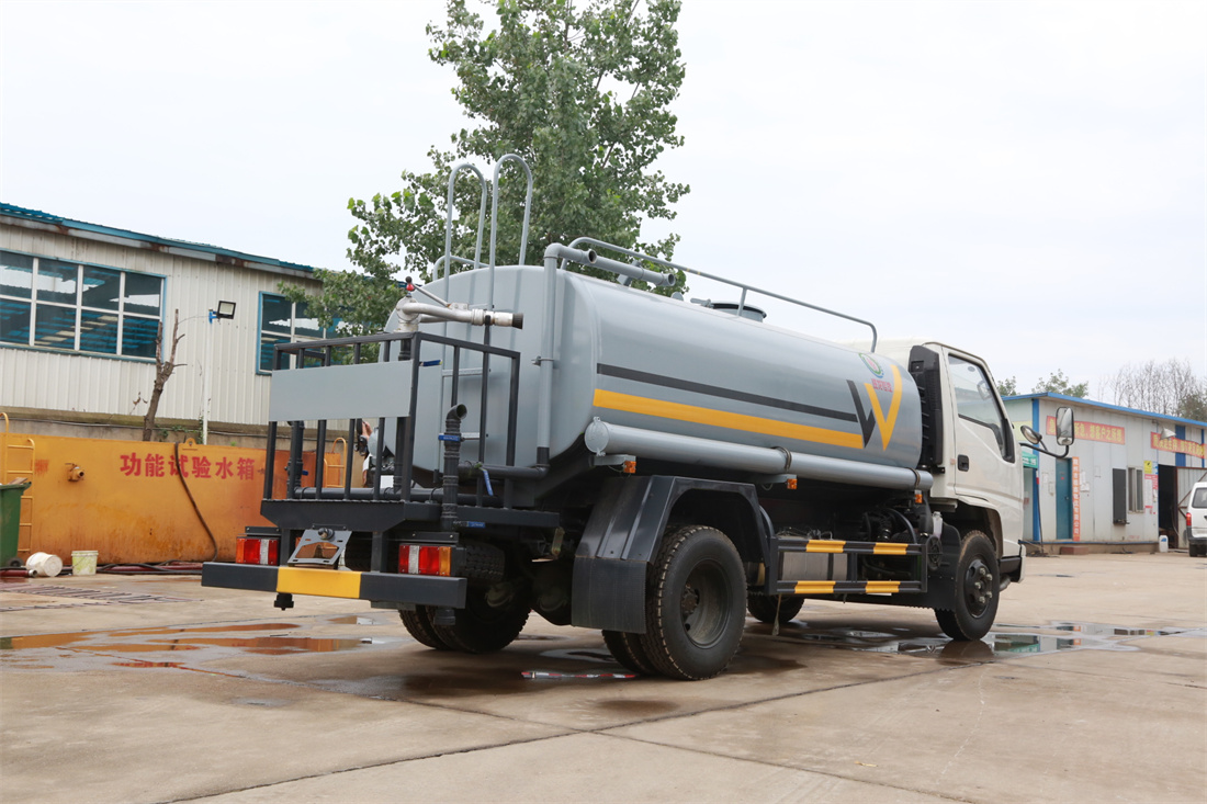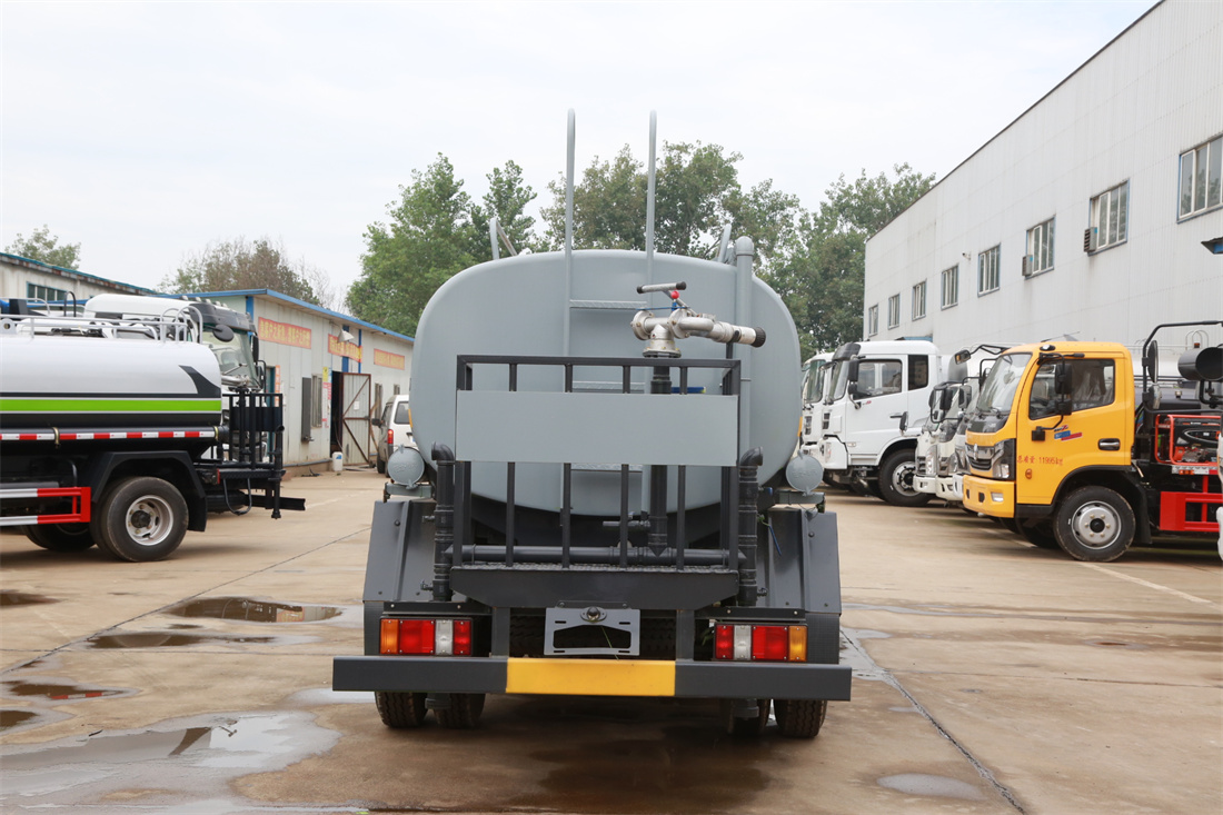 灑水車(chē)前裝有鴨形噴嘴或圓頭沖嘴,后面裝有圓柱開(kāi)灑水噴嘴或蓮蓬頭噴嘴,后部有一工作平臺(tái),裝配有水炮。后部還可裝8個(gè)噴嘴(選裝)。
