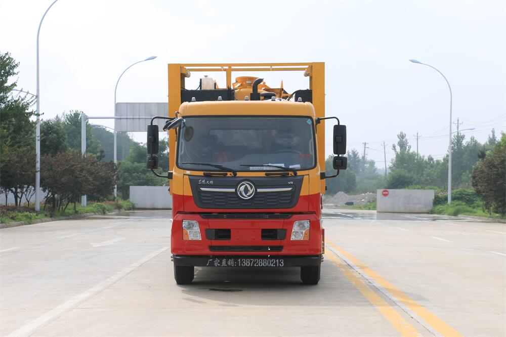 上裝配置:清水罐約 5 立方,污水罐約 10 立 方;罐體 8mm 厚,封頭 8mm 厚,水罐、污罐可 互通,用 100 球閥**開關;清洗部份采用天 津通潔高壓泵,壓力 19Mpa,流量 215L/min, 配 80 米直徑 22 高壓管帶液壓卷盤;吸污部份 采用濰柴375馬力副發動機帶山東SK-30水循 環泵(副發自帶),吸污罐帶舉升,后封頭焊 死(可選擇后封頭全開),尾部加裝一個 600mm 快開,罐體后尾部一個 DN150 排污口球閥,一 個 DN100 吸污球閥帶出口盤,一個視污窗,一 根 10m 吸污管,一套陰陽端,壓力表,防溢 閥,箭頭燈,工具箱,淋管裝置,高壓泵帶氣 吹水。配一個 4.5 公斤水雷噴頭,另帶一個 80 公分手持洗車噴頭。