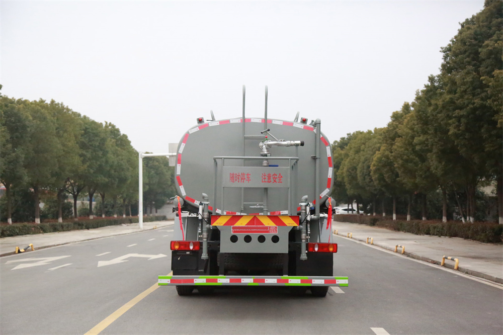 灑水車(chē)前裝有鴨形噴嘴或圓頭沖嘴,后面裝有圓柱開(kāi)灑水噴嘴或蓮蓬頭噴嘴,后部有一工作平臺(tái),裝配有水炮。后部還可裝8個(gè)噴嘴(選裝)。