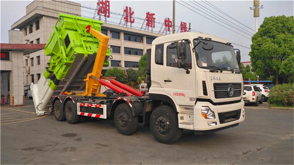 5、將汽車底盤倒進(jìn)車位,鉤起機(jī)箱,將垃圾運往垃圾處理場。